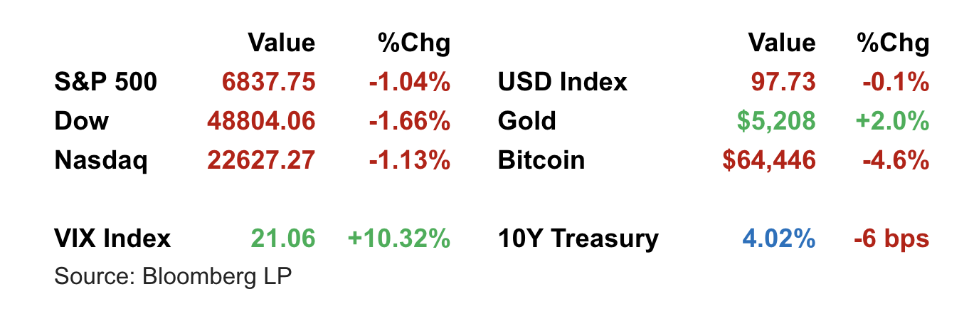 Defensive Rotation Gains Traction: Safe-haven flows pushed the 10-year Treasury yield down to around 4.03%, and gold surged to fresh highs above $5,200 an ounce. Crypto assets weakened, with Bitcoin falling more than 4%, underscoring the broader pullback in risk assets. Sector leadership tilted away from high-multiple growth and toward more defensive positioning, with strategists emphasizing balance between growth and value exposures as AI and policy risks evolve.