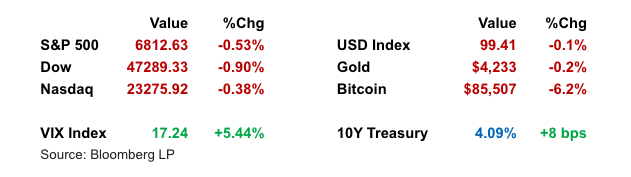 U.S. equities slipped to start December as investors took a breather following a strong November run. Risk appetite faded amid a sharp selloff in cryptocurrencies and a rise in global bond yields, pressuring small caps and tech shares. Despite some softness, the pullback appeared orderly, and seasonal trends could still support equities later this month. Treasuries weakened as Japanese bond yields surged, and Friday’s upcoming inflation data looms as the next key test.