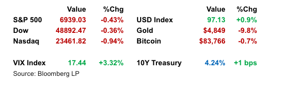 Markets ended the week on a volatile note as President Trump’s nomination of Kevin Warsh to succeed Jerome Powell as Fed Chair jolted rate expectations and triggered the biggest dollar rally since May. Equities pulled back across the board, with tech leading losses, while precious metals plunged and long-dated Treasury yields ticked higher. Despite Friday’s weakness, the S&P 500 still capped off its strongest month since October.