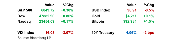 Yields Fall, Dollar Softens Sharply: Treasury yields declined across the curve, with the 2-year settling at 3.48% and the 10-year at 4.06%. The U.S. dollar saw its worst day since September, particularly under pressure against low-yield currencies like the yen. Strategists noted that the greenback is aligning more closely with the dovish shift in rate expectations, increasing downside risks in the near term.