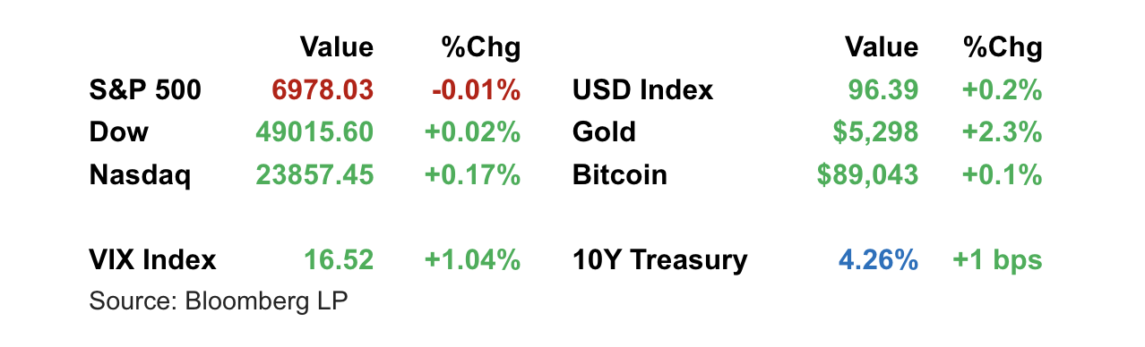 Markets ended the day mostly flat after the Fed held interest rates steady and Jerome Powell signaled no urgency to resume cuts. The S&P 500 briefly crossed the 7,000 mark before fading, while the Nasdaq managed a modest gain. Treasury yields and the dollar were steady, and gold surged past $5,300, reflecting cautious investor sentiment. Tech earnings after the bell became the next focal point, as Fed policy took a backseat—for now.