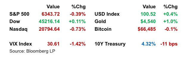 Markets remained under pressure but showed signs of stabilization as investors balanced geopolitical risks with a more measured Federal Reserve outlook. Equities extended their recent pullback, led by weakness in semiconductors, while Treasuries rallied after Fed Chair Jerome Powell downplayed immediate inflation risks from rising oil prices. Crude’s surge above $100 continued to dominate sentiment, reinforcing growth concerns but also shifting rate expectations back toward potential easing.