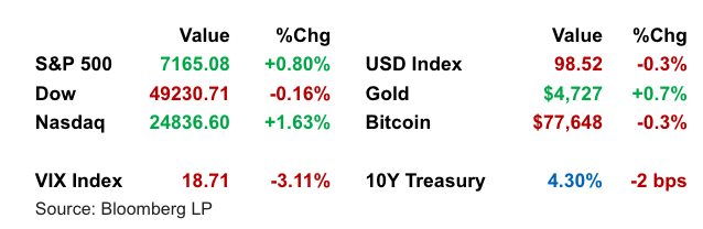 Stocks finished mostly higher Friday, with the S&P 500 and Nasdaq extending their weekly winning streaks and setting fresh records as optimism around potential US-Iran talks helped ease oil-price concerns. Tech led the advance after Intel’s strong results and upbeat AI-driven outlook, while Treasury yields and the dollar edged lower as investors also digested news that the Justice Department closed its probe into Fed Chair Jerome Powell.