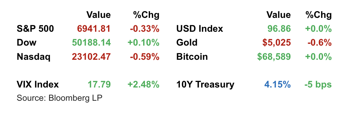 US equities paused after a strong run as weaker-than-expected December retail sales reinforced expectations for Federal Reserve rate cuts later this year. Treasury yields fell to their lowest levels in about a month, but equity gains were uneven, with tech weighing on the broader market even as the Dow and equal-weighted S&P 500 notched fresh highs. Markets are now firmly focused on the upcoming jobs report as the next catalyst.