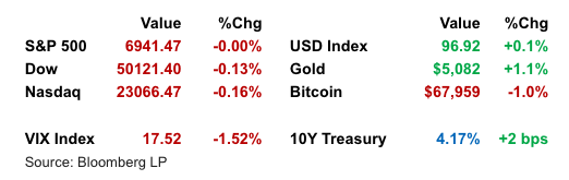 Stocks Stall as Rates Rise: Major indexes finished little changed after an early rally. Roughly 300 S&P 500 names advanced, signaling underlying breadth, but megacap weakness weighed on the headline index. The equal-weight index outperformed, reinforcing the “broadening” theme toward cyclicals and old-economy sectors. Semiconductors outperformed, while software stocks lagged. Investors appear increasingly comfortable with growth holding up, but are recalibrating valuations in a higher-for-longer rate environment.