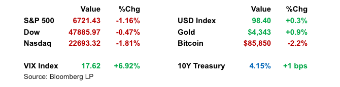Markets took a sharp turn lower Wednesday, led by a renewed selloff in mega-cap tech and AI-related stocks. Skepticism around high valuations and slowing AI monetization pressured the Nasdaq and S&P 500, with both indexes logging their fourth straight day of losses. Tech weakness spilled into broader sectors, though the equal-weighted S&P 500 held up better, signaling early-stage rotation beneath the surface. Despite dovish Fed commentary and stabilizing bond yields, investors are questioning whether AI can continue to justify its outsized market leadership.