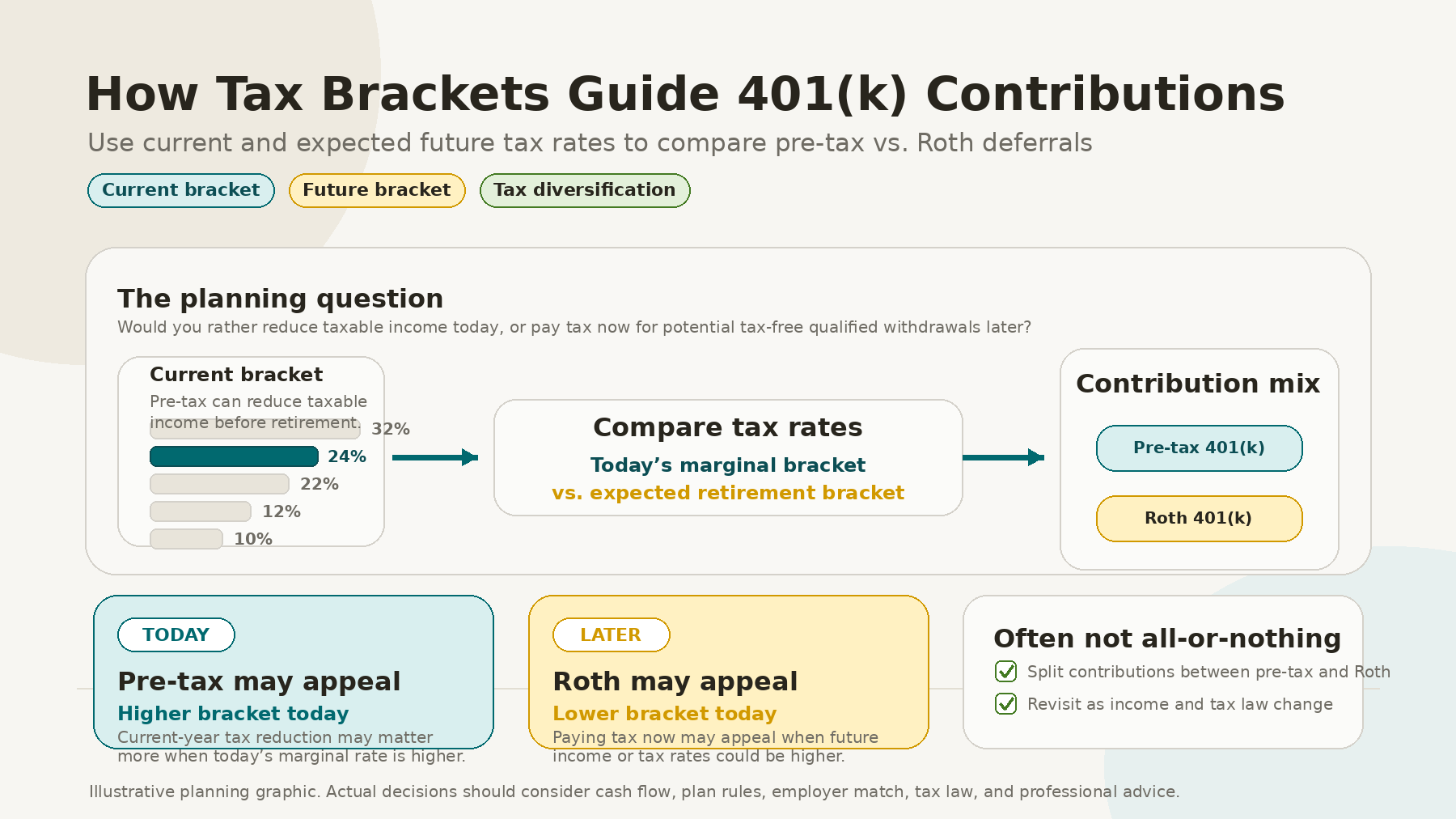 A 401(k) contribution can fulfill several functions. It may help investors build retirement assets, reduce current taxable income when made pre-tax, and qualify for an employer matching contribution if the plan offers one. The IRS says the 2026 elective deferral limit for employees participating in 401(k), 403(b), most governmental 457 plans, and the federal Thrift Savings Plan is $24,500.